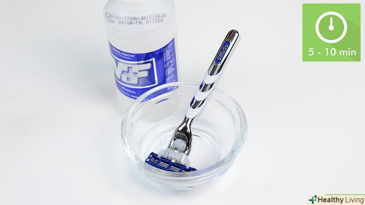 Залиште бритву замочуватися на 5-10 хвилин. якщо пройшло вже багато часу з тих пір, як ви в останній раз чистили бритву, або на ній накопичилося дуже багато бруду, можливо, Вам варто почистити її більш ретельно. Чим довше лезо буде замочуватися, тим краще спирт розщепить більші частинки бруду. [12]- У спирті, оцті і перекису бритву можна замочувати всю цілком. Так розчин видалить бруд навколо ручки і біля основи лез, дозволивши домогтися більш грунтовної очищення.