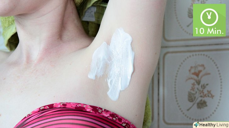 Зачекайте рекомендоване в інструкції кількість часу. як правило, цей час становить близько десяти хвилин. Однак ознайомтеся з інструкцією, що додається до крему, перш ніж використовувати його. [10]- Якщо ви відчуваєте печіння, видаліть крем з пахвовій області. Як правило, це означає, що у вас занадто чутлива шкіра або ви залишили крем на більш тривалий період, ніж це було необхідно. [11]