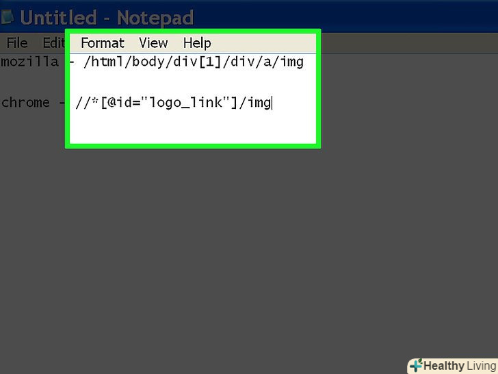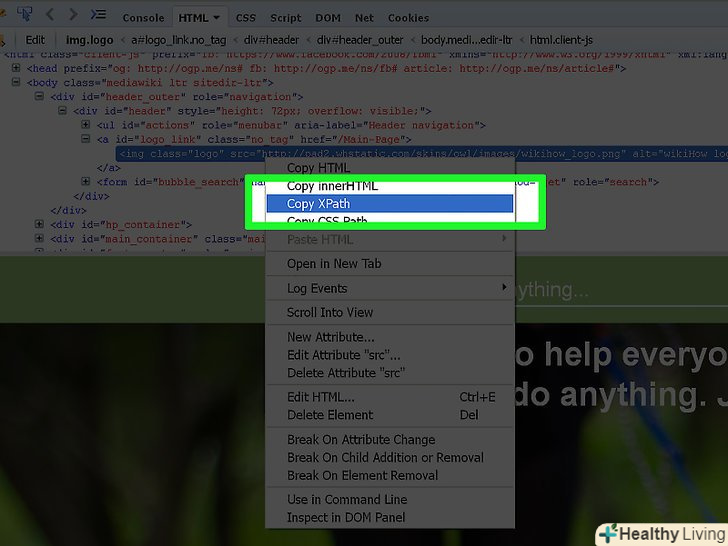 У верхній частині панелі веб-Інспектора зверніть увагу на XPath-шлях.скопіювати XPath-шлях не можна, але розширений шлях відобразиться над кодом на панелі веб-Інспектора. Кожна вкладка є формулою шляху.[1]