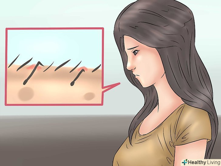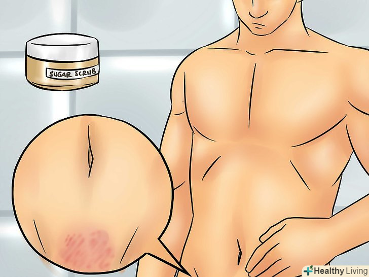 Позбавтеся від роздратування. роздратування – це невід'ємна частина процесу видалення волосся, і незалежно від того, який варіант ви вибрали, вам доведеться зіткнутися з роздратуванням хоча б на перших порах. [6] щоб звести до мінімуму кількість червоних точок, ви можете:- Відлущіть область за допомогою м'якого цукрового скрабу. Він допоможе вам позбутися від мертвих клітин шкіри і дозволить шкірі дихати. Якщо у вас немає під рукою цукрового скрабу, просто змішайте харчову соду і воду, що отримати пасту, яка володіє подібним ефектом.