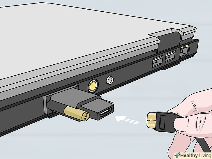 - При перетворенні в HDMI цей роз'єм підтримує як цифрове аудіо, так і відео високої чіткості. Знайдіть порти з написом "DP»або "DisplayPort". Якщо на ноутбуці або планшеті є DisplayPort, вам знадобиться кабель або адаптер DisplayPort-HDMI.[2]