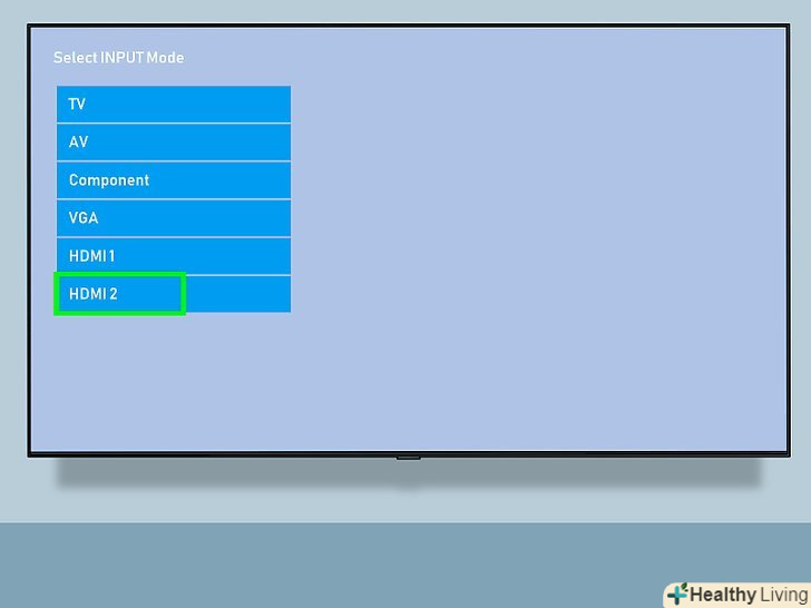 Переключіть телевізор на джерело сигналу з HDMI.використовуйте кнопку "SOURCE" або "INPUT" на телевізорі або пульті від нього, щоб вибрати порт HDMI. Швидше за все, вам доведеться кілька разів натиснути на кнопку, перш ніж ви дійдете до потрібного роз'єму. Коли ви перейдете на правильне джерело сигналу, на екрані з'явиться зображення пристрою.- Якщо у вас комп'ютер під управлінням ОС Windows, натисніть⊞ Win+p, щоб відкрити панель "проектувати", а потім перейдіть на трансляцію зображення на телевізорі. Якщо ви хочете відобразити робочий стіл, виберіть опцію "дублювати".