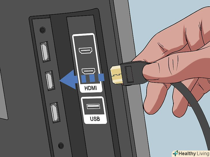 Підключіть один кінець кабелю до пристрою.Увімкніть пристрій, який хочете підключити до телевізора, а потім акуратно вставте відповідний кінець кабелю в його HDMI-роз'єм.- Коннектори HDMI-кабелю можна вставити тільки в одному напрямку. Ніколи не намагайтеся силою вставляти коннектор кабелю в роз'єм, так як це може привести до поломки не тільки кабелю, але і самого пристрою.