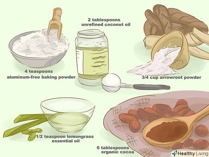 Приготуйте власний антиперспірант. в Інтернеті є безліч рецептів, і один з них наведено нижче. Змішайте 3/4 склянки (100 грамів) аррорута (марантового крохмалю) з 4 чайними ложками (15 грамами) пекарського порошку, що не містить алюмінію. Розтопіть разом в пароварці 6 столових ложки (90 мілілітрів) органічного масла какао або манго і 2 столові ложки (30 мілілітрів) неочищеного масла кокоса. Перемішайте розтоплені інгредієнти, а потім додайте 1/2 чайної ложки (2,5 мілілітра) ефірного масла лемонграсу.- Зберігайте суміш у скляній банці, що закривається. Банку можна не ставити в холодильник.