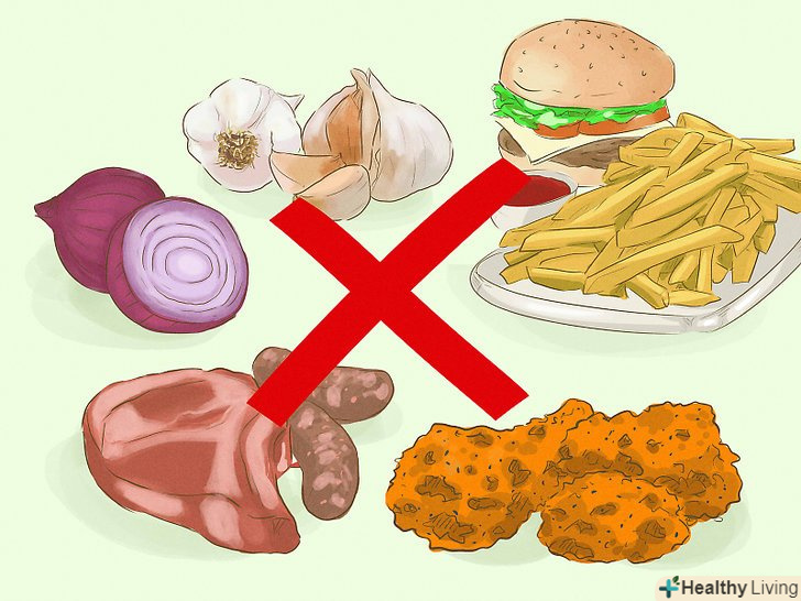 Виключіть зі свого раціону продукти, які підсилюють запах. безліч видів їжі, наприклад жирні страви (жирне м'ясо, птиця зі шкірою, Смажена їжа) і деякі спеції (каррі, часник, цибуля), здатні впливати на запах тіла. Не вживайте ці продукти протягом 2-4 тижнів і подивіться, чи допоможе це.