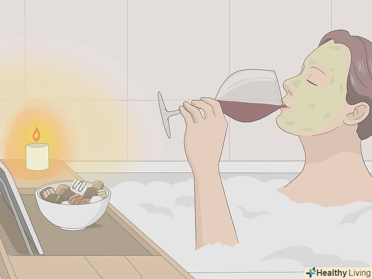 Насолодіться келихомВина і смачною закускою, поки будете приймати ванну. скористайтеся цією можливістю, щоб побалувати себе особливим частуванням. Незважаючи на те що найпопулярнішим ласощами є шоколад і цукерки, можна вибрати, що завгодно! Однак краще уникати продуктів, які можуть залишити крихти у воді. [12]- Якщо ви не п'єте вино, виберіть щось інше! Газована вода теж дозволить вам відчути себе особливою, плюс вона випускається з величезною кількістю смаків. Можна навіть насолодитися кавою або чаєм, якщо вони не будуть занадто гарячими.