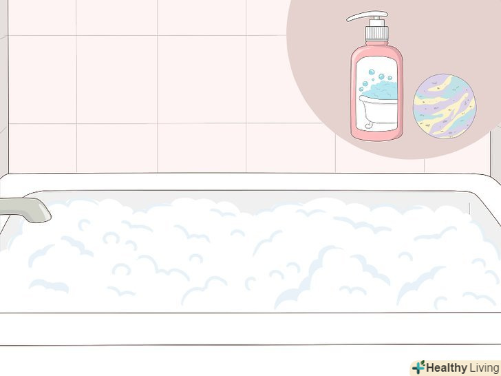Додайте трохи піни або бомбочку для ванни в якості ароматерапії. можна зробити піну або бомбочку для ванни самостійно або придбати готові засоби в магазині. Піна для ванни дозволить вам полежати в бульбашках, які розслаблюють і піднімають настрій, а бомбочки для ванни відомі тим, що надають воді красиві відтінки (а це теж дарує додаткове задоволення). [4]- Якщо ви будете використовувати піну для ванни, налийте приблизно 1/8 склянки (30 мл) рідини в ванну, поки вона буде наповнюватися водою. Струмінь перемішає і розподілить бульбашки у воді.