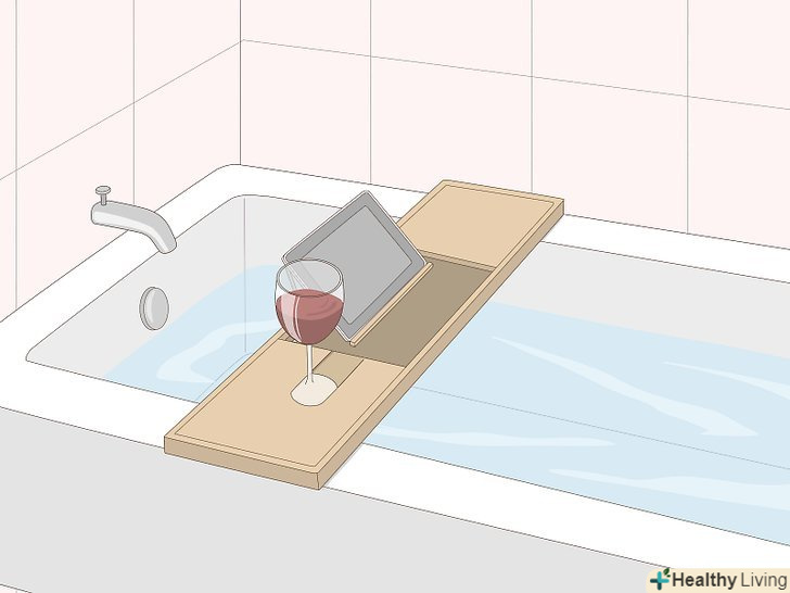 Використовуйте спеціальний столик або поличку, щоб не намочити речі. завдяки столику у вас буде місце для напою, закусок, книг або інших речей, які ви захочете взяти з собою. Встановіть столик, поки ванна буде наповнюватися, і покладіть на нього все необхідне, щоб заздалегідь підготуватися. [9]- Можна купити столик для Ванни, у якого є підставки для зберігання книг або журналів, прорізи для ніжок келихів для вина і багато іншого.