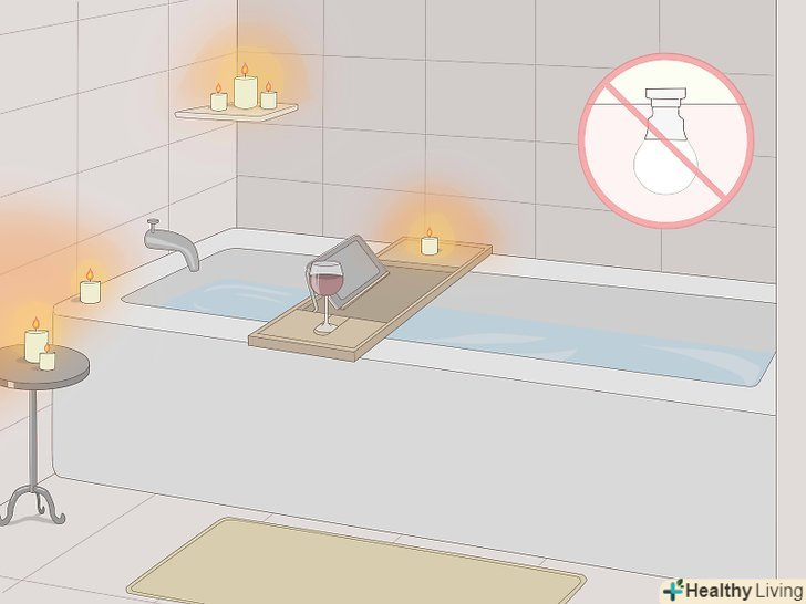 Приглушіть світло і запаліть кілька свічок для розслабляючого і естетичного ефекту. яскраве верхнє світло, швидше за все, завадить вам розслабитися, тому можна приглушити його або повністю вимкнути. Розставте свічки по краях ванни, якщо там є місце. [10]- Використовуйте свічки без запаху, якщо ви вже додали в воду ефірні масла або ароматичну піну для ванни. Якщо ж ви не використовували Ароматичні засоби, запаліть одну зі своїх улюблених ароматичних свічок, щоб насолодитися запахом, приймаючи ванну.