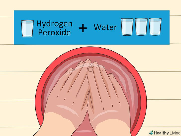 Змішайте 1 частину перекису водню з 3 частинами води. змішавши перекис водню і воду, ви створите безпечне для рук дезінфікуючий засіб. Занурте руки в рідину на 1-3 хвилини, і перш, ніж сушити їх, сполосніть в теплій воді. [11]