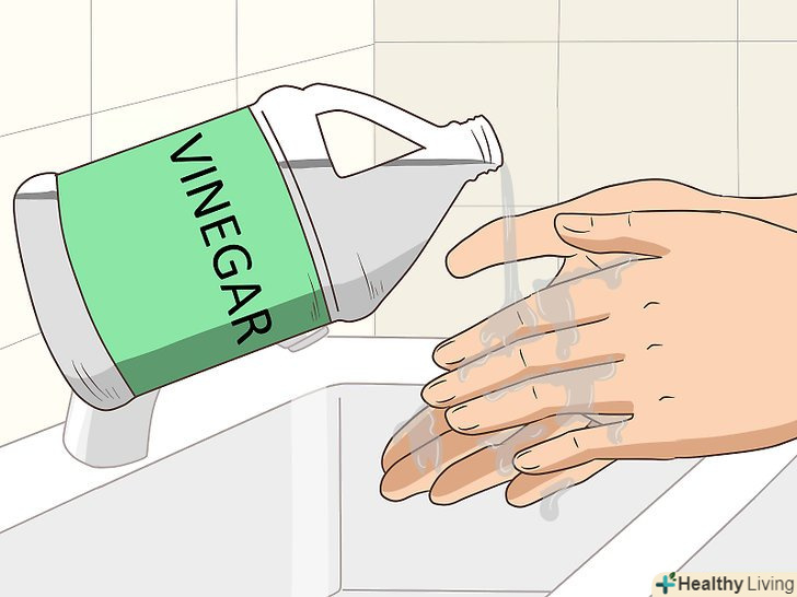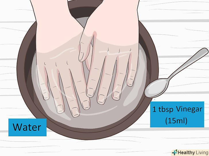 Додайте 1 столову ложку (15 мл) оцту у воду, щоб зробити розбавлений розчин. наповніть маленьку миску звичайною водою і додайте туди 1 столову ложку (15 мл) оцту. Занурте руки в рідину на 2-3 хвилини. Після помийте їх в чистій воді. [13]