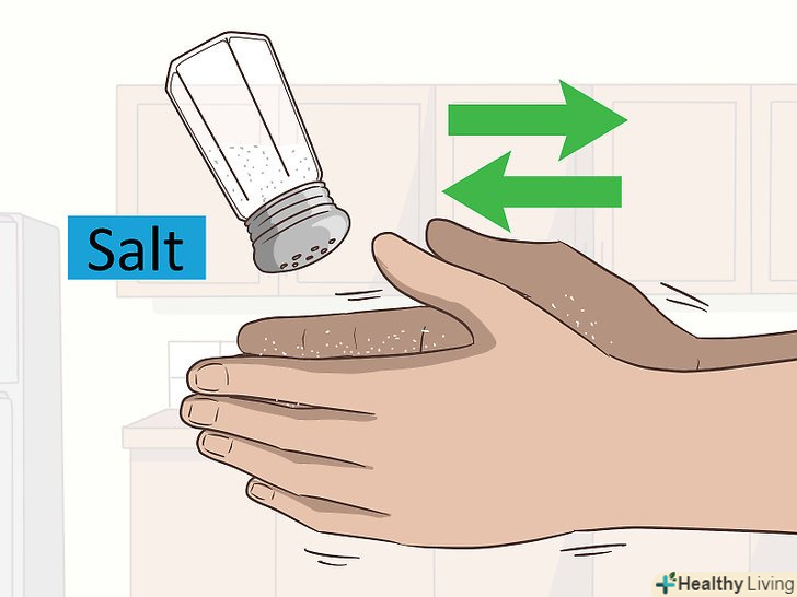 Потріть руки мокрою сіллю, щоб створити ефект скрабу. насипте трохи солі на долоні і потріть руки один об одного. Для кращого вбирання можна трохи змочити сіль водою. Після змийте в проточній воді і висушіть руки. [7]- Також можна намилити руки засобом для миття посуду перш, ніж посипати їх сіллю. Потріть долоні, щоб усунути запах, а потім сполосніть руки в чистій воді. [8]