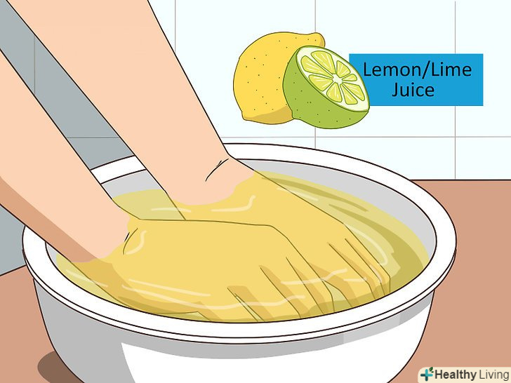 Нейтралізуйте запах на руках за допомогою соку лимона або лайма. лимонний сік можна використовувати як нерозбавленим, так і з додаванням невеликої кількості води, щоб пом'якшити його різкий вплив на шкіру. Також підійде і сік лайма. Просто вичавіть в миску лимон або лайм і занурте руки в рідину. [12]- Якщо змішати в мисці 1 частина соку лимона або лайма з 1 частиною води, вийде ефективний засіб для відмочування рук.