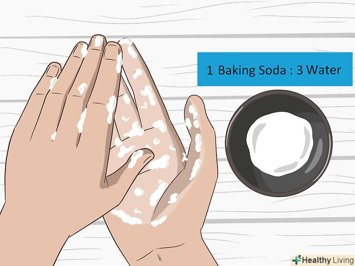 Зробіть суміш з 1 частини харчової соди і 3 частин води. змішайте разом 1 частина харчової соди і 3 частини води до утворення пасти. Ретельно розтирайте по всій поверхні рук протягом хоча б однієї хвилини. А потім змийте чистою водою. [10]