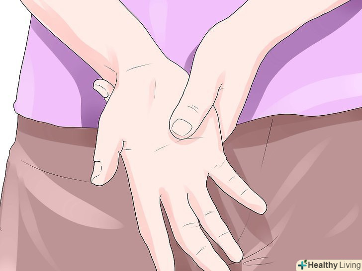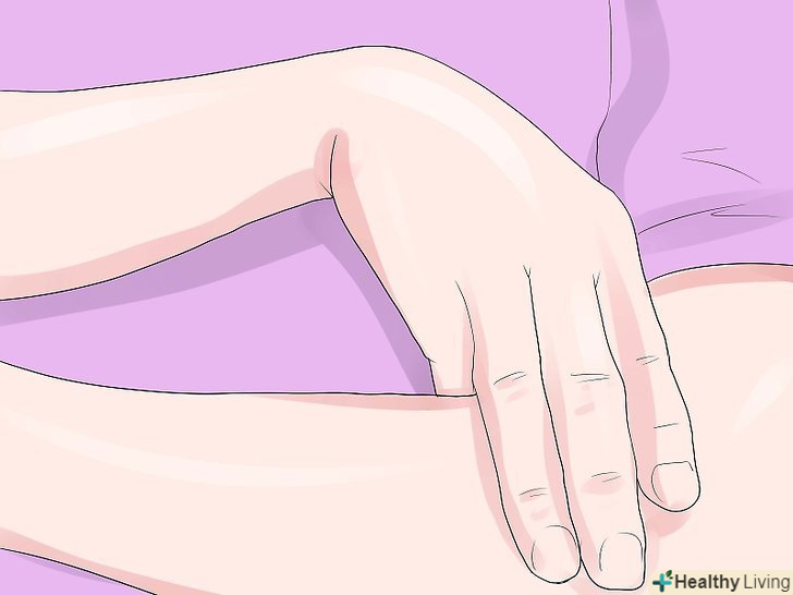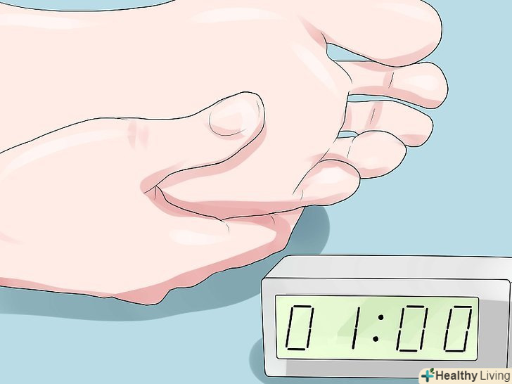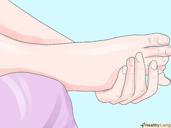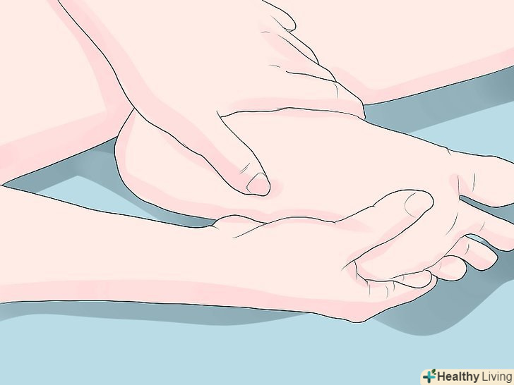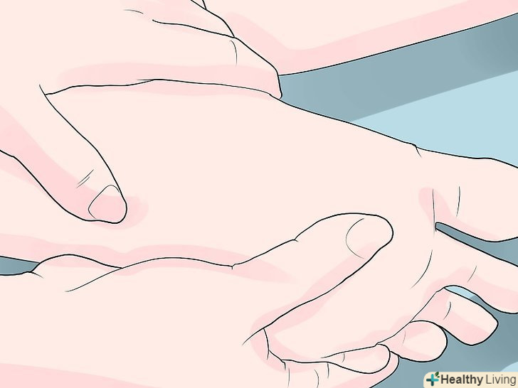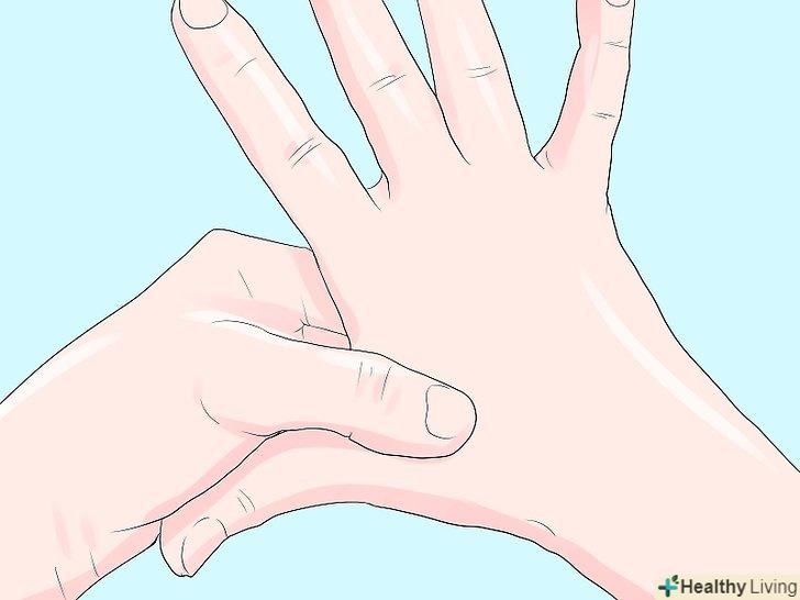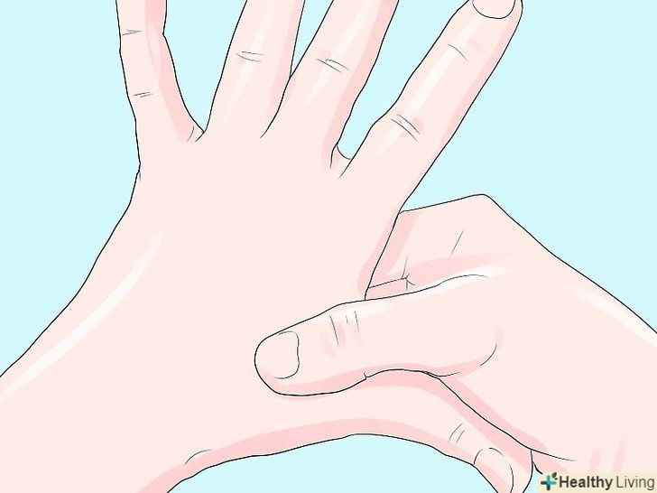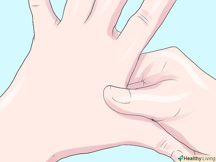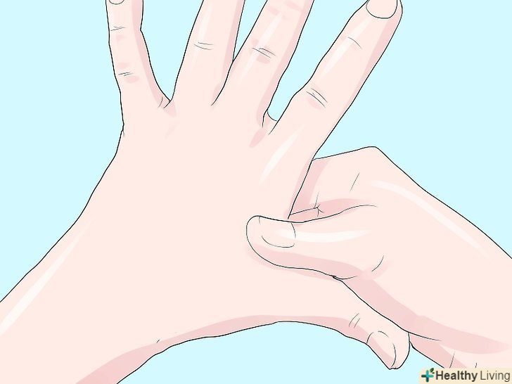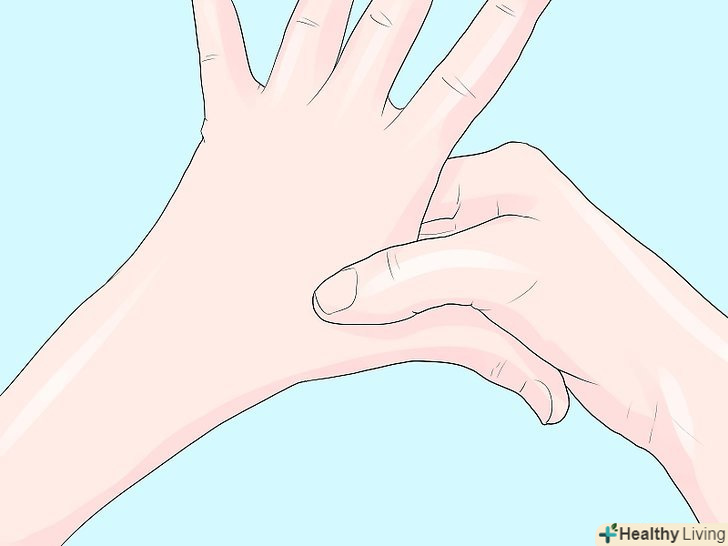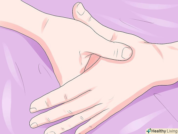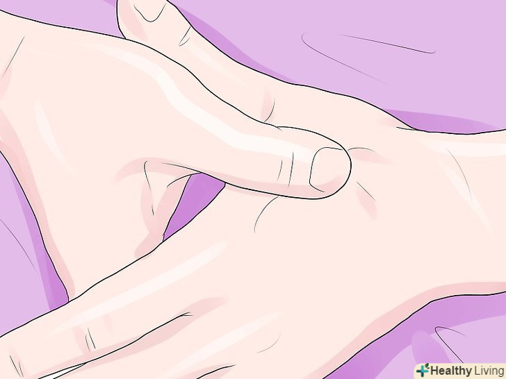 Натисніть на цю точку зверху великим пальцем лівої руки і знизу вказівним пальцем лівої руки. інші пальці лівої руки опустіть. Пальці правої руки повинні бути розслаблені і злегка зігнуті.- Коли ви вперше сильно натиснете на певну точку, ви, ймовірно, відчуєте легкий біль або печіння. Це означає, що ви натискаєте в потрібному місці. Біль скоро пройде, а це відчуття, швидше за все, стане з часом менш болючим.