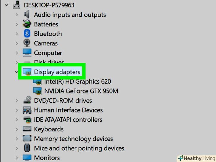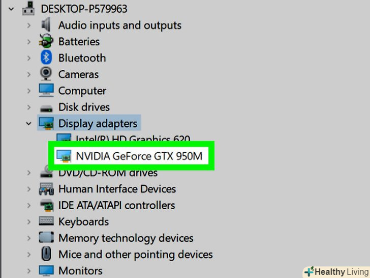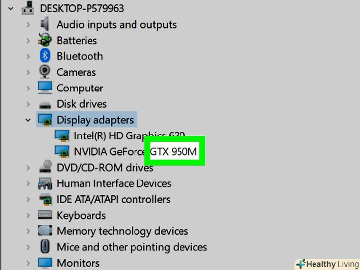 Зверніть увагу на модель відеокарти.потрібно дізнатися модель і номер відеокарти, щоб завантажити правильні драйвери. Ця інформація відобразиться після імені виробника карти.- Наприклад, якщо в списку вказана відеокарта "NVIDIA GeForce GTX 670", то виробник графічного адаптера — NVIDIA, модель — GeForce, номер моделі — GTX 670.