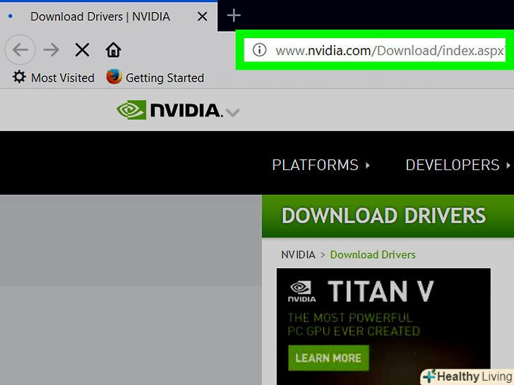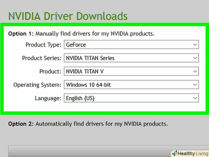 Знайдіть свою відеокарту на сайті.для цього введіть модель і її номер в рядку пошуку або знайдіть їх в випадаючому меню. На всіх трьох сайтах є функція автоматичного виявлення, за допомогою якої сайт сам визначить модель вашої відеокарти. Можливо, вам доведеться прийняти деякі попередження про безпеку, перш ніж запустити цю функцію.- Якщо відеокарта старше чотирьох-п'яти років, швидше за все, виробник її більше не підтримує і нових драйверів для неї немає.