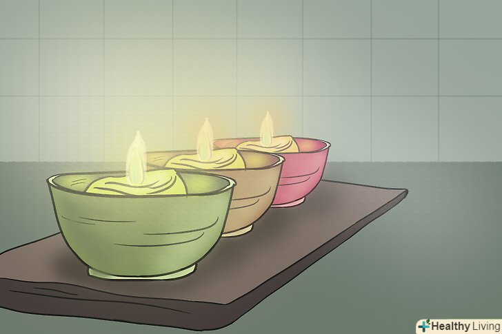 Приглушіть світло і запаліть свічки. Необов'язково використовувати ароматичні свічки, хоча трохи приємного запаху не завадить. Якщо ви не готові запалювати свічки, використовуйте електронні свічки. Але будьте обережні: якщо вони впадуть у воду, вони згорять. Можна також використовувати новорічну гірлянду-вона створить м'який приглушене світло, якого буде достатньо, щоб все бачити, і який не буде відволікати вас. [4]- Якщо вам не подобаються свічки, можна використовувати ароматизатори для дому, ароматичний віск або ефірні масла в аромалампі.