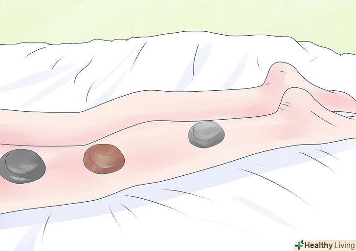 Покладіть три гарячі камені на ліву ногу людини. існує певна методика виконання терапії з гарячими каменями. Покладіть один камінь на середину стегна, ще один – на середину гомілки і залишився – під колінну чашечку.