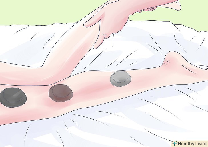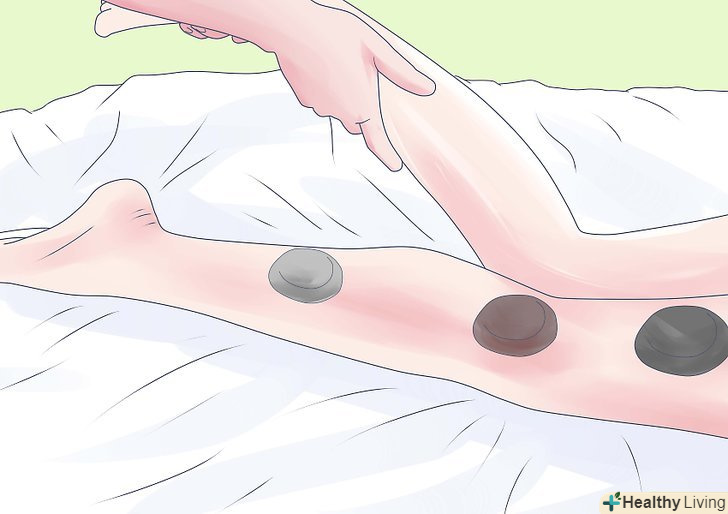 Видавіть невелику кількість масажного масла на руку і втирайте його в праву ногу людини. терапія з гарячими каменями передбачає використання каменів в якості інструменту для масажу. Потріть гарячий камінь об ногу рухом вгору-вниз.