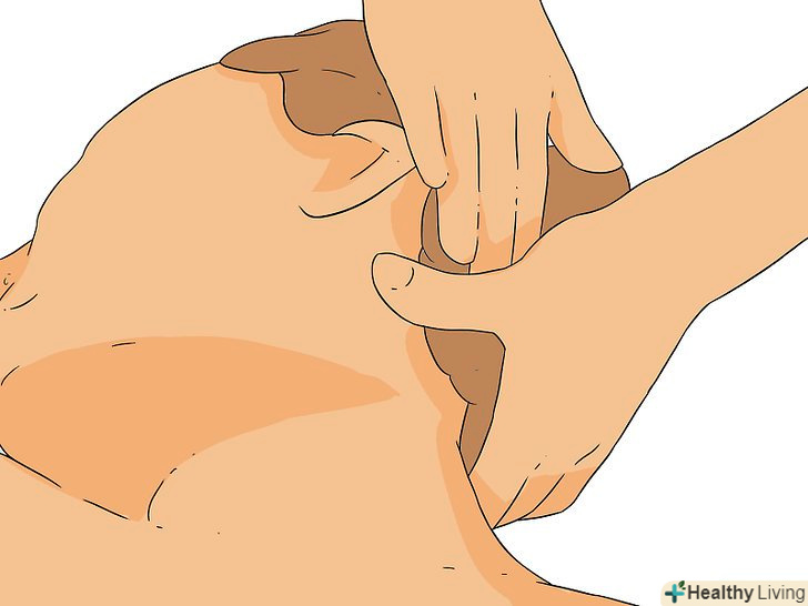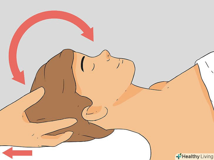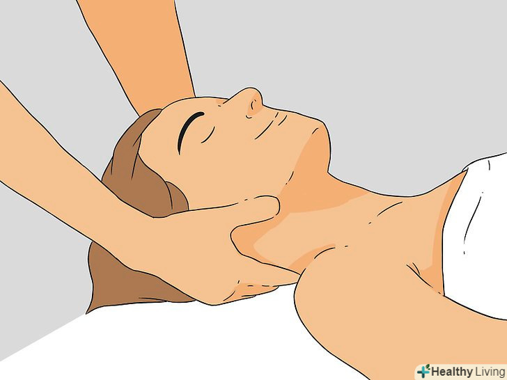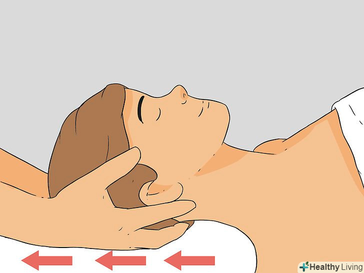Помасажуйте шию. візьміться долонею за шию ззаду. Плавними рухами масажуйте великим пальцем з одного боку шиї і іншими пальцями з іншого. Перемістіть долоню зверху вниз і назад, продовжуючи масажувати. Намагайтеся зміщувати шкіру при масажі, а не просто розтирати її поверхню. [7]- Цим же способом можна масажувати голову біля основи черепа в тому місці, де починаються волосся. [8]