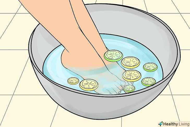 Для початку нехай людина розпарить ноги в гарячій воді з додаванням нарізаних фруктів. попросіть людину сісти в зручне крісло. Потім налийте від 15 до 19 літрів теплої води у відро або таз. Наріжте на часточки лайм, лимон або апельсин і висипте фрукти в воду. Попросіть людину не поспішаючи опустити ноги в воду на п'ять хвилин. [10]- Поки стопи відмокають у воді, спробуйте акуратно масажувати їх скибочками фруктів.