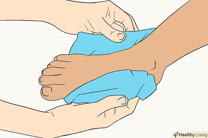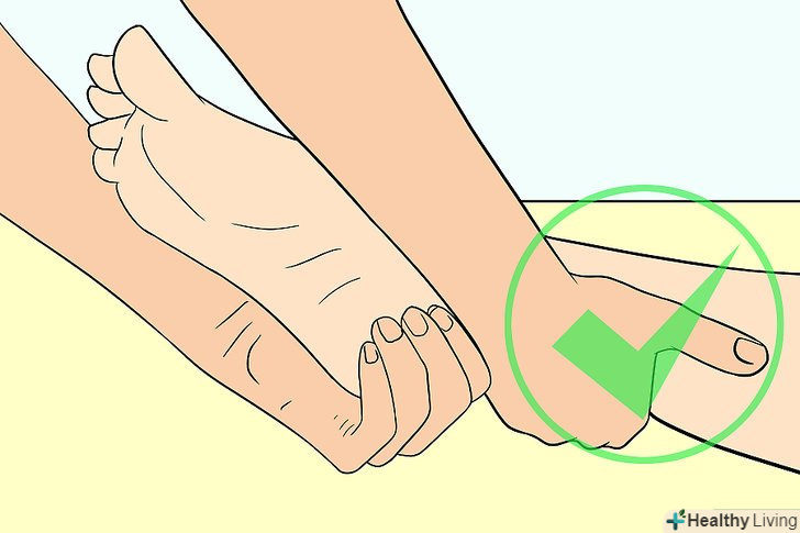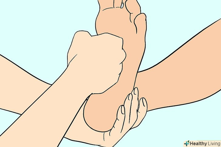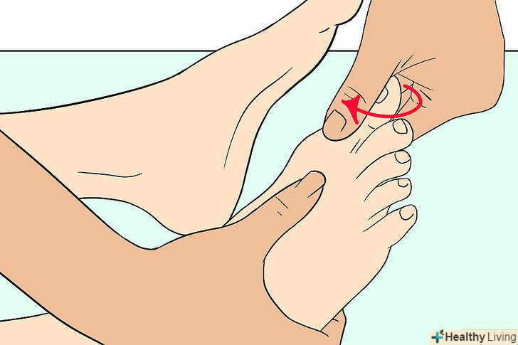 Зробіть глибокий масаж щиколоток. знайдіть впадинку нижче щиколотки. Використовуйте великий або вказівний палець для м'якого стиснення цієї області протягом декількох секунд. Потім ви можете використовувати великі пальці для кругових рухів навколо щиколоток. Рівномірно натискайте на цю область, щоб зняти напругу. [7]- Якщо щиколотки сильно затекли або болять, ви можете спробувати взяти п'яту в одну руку, складену жменею, а іншою рукою схопити подушечку стопи. Потім повільно поверніть ногу три рази за годинниковою стрілкою і ще три рази проти годинникової стрілки.