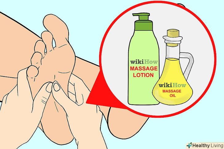 Капніть трохи масажного масла або лосьйону на руки. потріть руки, щоб розігріти лосьйон. Масло або лосьйон допоможе пом'якшити загрубілу шкіру і зменшить тертя між вашими руками і ногами людини, якій ви робите масаж. [12]- Масажне масло або лосьйон з натуральних інгредієнтів пом'якшать шкіру. Використовуйте для масажу масло какао, кокосове масло, масло чайного дерева або евкаліпта.