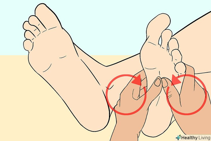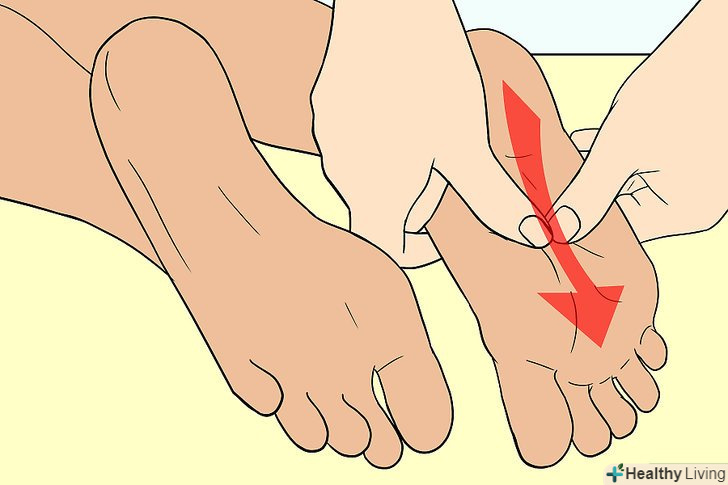 Масаж зводу стопи. злегка натискаючи, помасажуйте великими пальцями звід стопи (перед подушечкою стопи). Використовуйте кругові рухи: одним пальцем масажуйте ступню за годинниковою стрілкою, а іншим — проти годинникової стрілки. Робіть це не менше 30 секунд. [3]- Покладіть великі пальці на протилежні сторони стопи і просувайтеся до її середини. Зробіть це принаймні три-п'ять разів, рухаючись вгору і вниз по стопі.