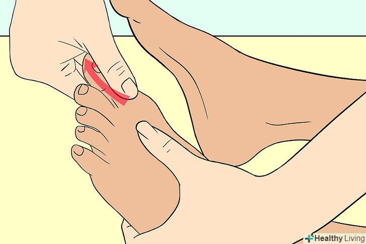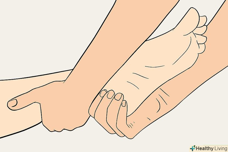 Стисніть і потягніть кожен палець. Тримайте ногу однією рукою, прямо під склепінням стопи. Іншою рукою, а точніше її великим пальцем, натисніть на великий палець ноги. Ваш вказівний палець при цьому повинен бути прямо під великим пальцем ноги. Поверніть палець трохи в сторону і потягніть його зверху вниз. Поверніться до верхньої частини пальця і натисніть на нього великим і вказівним пальцями. Повторіть цю дію для кожного пальця, щоб розслабити їх. [5]- Не смикайте за пальці, так як це може привести до травми. Замість цього, просто крутите, потягуйте і натискайте на кожен палець, прикладаючи мінімум зусиль.