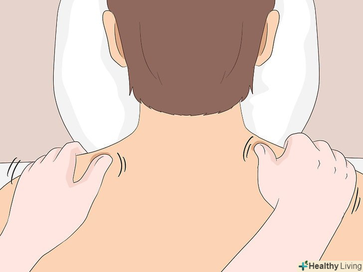 Далі займіться шиєю і плечима. коли ви завершите роботу з плечима, то можете за допомогою давлять і відпускають рухів помасажувати шию і голову по лінії росту волосся. Пам'ятайте, що вам треба тримати руки по обидві сторони хребта.- Покладіть руку на кожне плече і вминайте акуратно великі пальці в м'язи плеча. Ви також можете стискати пальцями невеликі ділянки тіла, але не варто проробляти дані руху в області ключиці, так як це може бути дуже болючим.