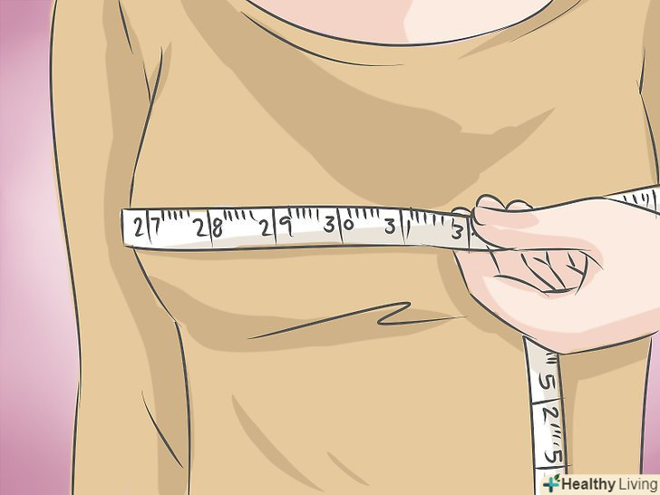 Використовуйте рулетку для вимірювання окружності найширшої частини грудей. як правило, рулетка повинна перетнути соски. Тримайте сантиметр паралельно підлозі. Не тримайте його занадто туго, але і не послаблюйте сильно, інакше ви отримаєте неправильний розмір.