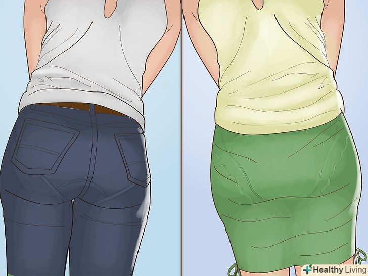 Уникайте надмірно обтягуючого одягу. Сильно обтягуючий одяг обов'язково зробить видимими трусики, якщо вони є. Якщо вам некомфортно ходити без трусиків або носити стрінги, але ви хочете позбутися від видимих ліній трусиків, відмовтеся від обтягуючих брюк і спідниць.- Найчастіше лінії трусиків бувають помітними на легінсах. Якщо ви хочете носити легінси зі звичайними трусиками, просто доповніть наряд тунікою або довгою сорочкою. Сорочка приховає ваші сідниці, тому вам не доведеться хвилюватися про те, що трусики помітні під легінсами.