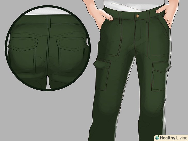 Вибирайте одяг з більш щільних тканин. спідниці та брюки з щільних текстурованих тканин помітно рідше проявляють лінії трусиків, ніж одяг з шовковистих тканин і тонкого трикотажу. Якщо ви не бажаєте переживати про видимих лініях трусиків, зупиніть свій вибір на одязі з джинси і твіду, а не з трикотажу або шовку. [18]- Задні кишені на брюках створюють собою додатковий шар тканини, який здатний допомогти приховати видимі лінії трусиків на сідницях.
