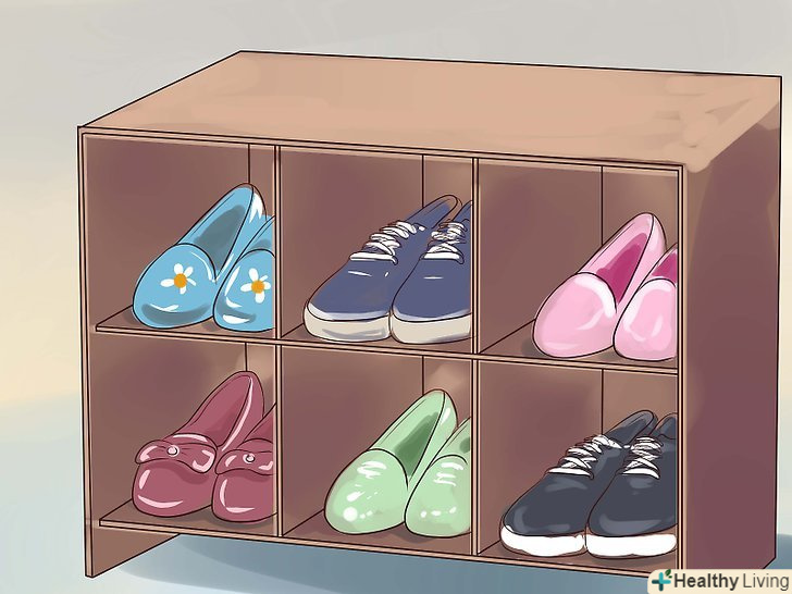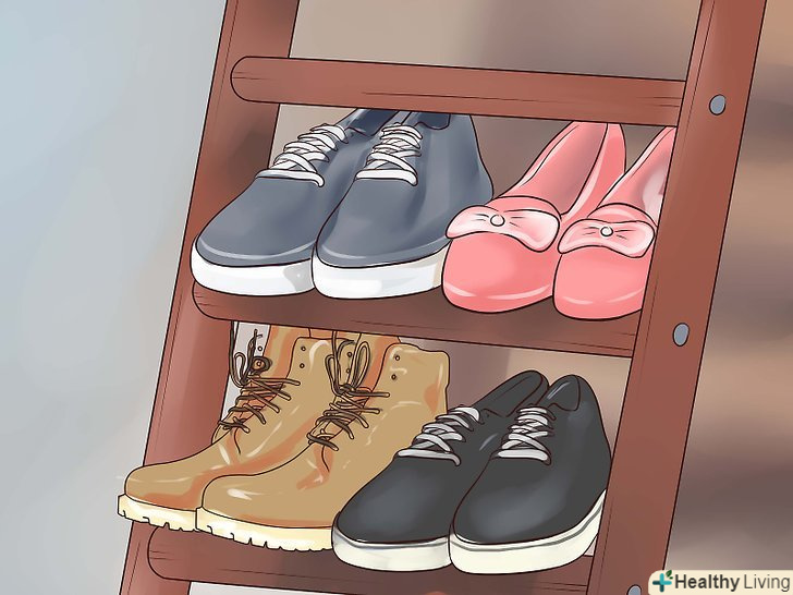 - Інший варіант - це використання дерев'яної Вішалки для взуття, яку можна купити в господарському магазині. Така вішалка створена спеціально, щоб зберігати взуття по парам в окремих кишеньках. Прикріпіть вішалку до стіни за допомогою цвяхів, щоб вона міцно трималася. Можливо, ви не захочете зберігати в ній хорошу шкіряне взуття, однак, вона ідеально підходить для в'єтнамок, тенісний туфель і т. д.