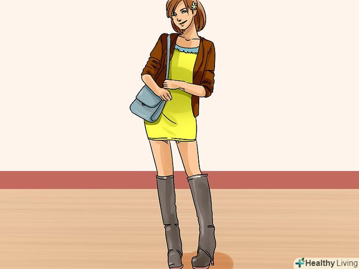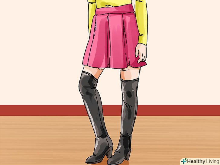Одягніть сміливі чоботи, щоб заявити про себе. для залучення уваги вибирайте високі чоботи по коліно яскравих кольорів, таких як червоний, фіолетовий або ковбойські чоботи з вишивкою, яскравим візерунком або ж чоботи на високій шпильці. При носінні яскравого взуття вибирайте ансамбль з нейтральної і однотонної одягу. [6]