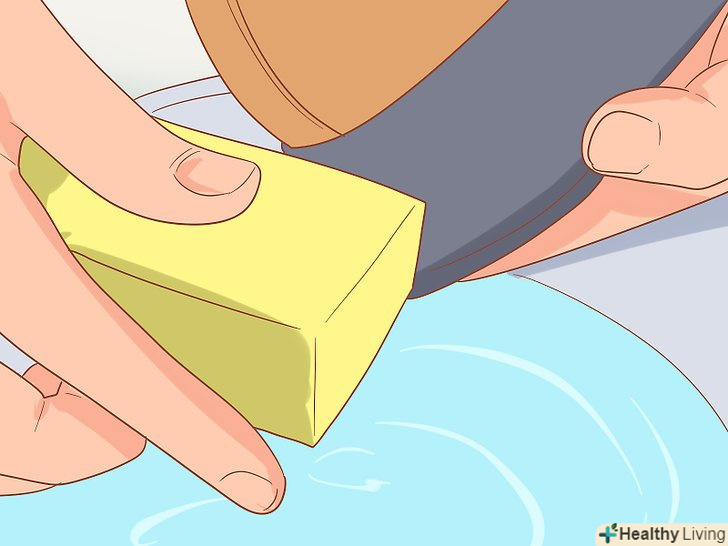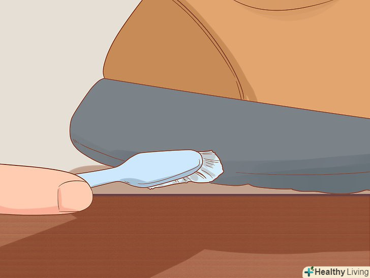 Промийте підошви теплою мильною водою за допомогою зубної щітки. налийте води в склянку і додайте туди ложку засобу для миття посуду. Занурте в розчин зубну щітку і почистіть щіткою підошви кросівок. [2]- Підошву треба терти із зусиллям. Чим сильніше ви трете, тим більше бруду змиється з підошов.