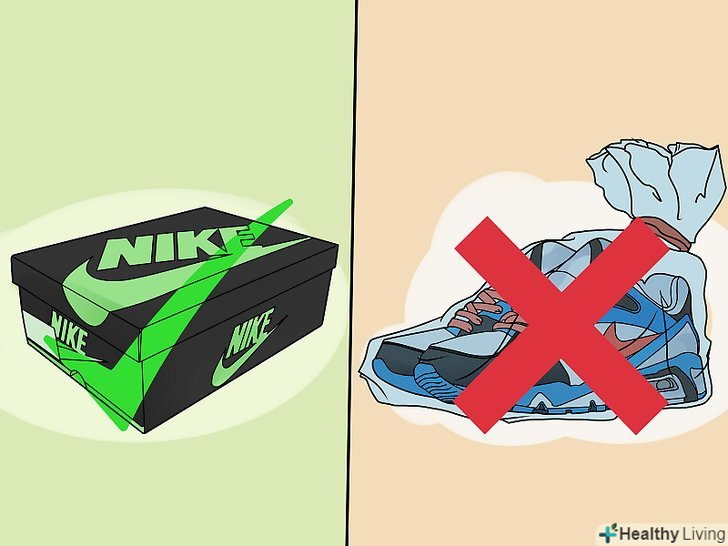 Огляньте упаковку. більшість підроблених взуття не поставляється в оригінальній упаковці Nike. Замість цього взуття упаковують в прозорий пластик або зовсім поставляють без упаковки. [6]- Більшість підроблених коробок Nike склеюють в поспіху, відповідно, вони не такі міцні, як оригінальні.