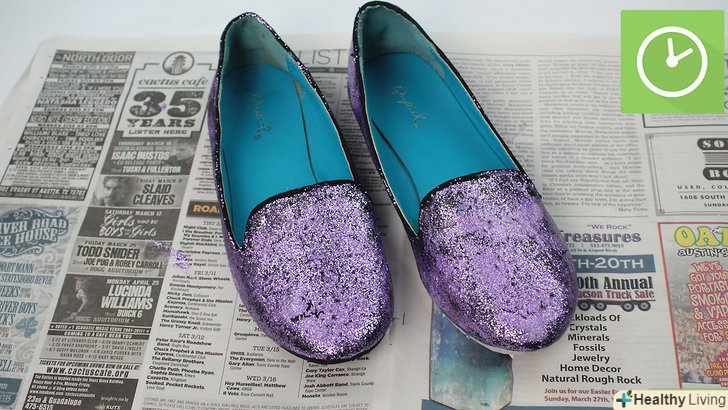 - Після того, як рівномірно покриєте обидві туфлі клеєм з блискітками, поставте їх сушитися куди-небудь, де їх не дістануть цікаві домашні тварини і діти!
