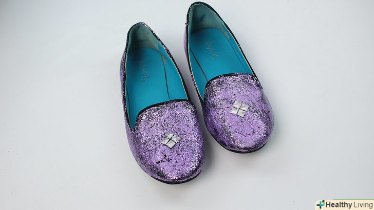 Дайте взуттям висохнути. після фінішного шару клею або спрею помістіть туфлі в добре провітрюване місце і дайте їм добре просохнути. Найкраще залишити їх сохнути на всю ніч. Переконайтеся, що їх ніхто не зачепить, поставте подалі від маленьких, цікавих ручок і лапок.- Додайте додаткові деталі. якщо хочете, ви можете додати додаткові деталі до туфель, такі, як стрази або пряжки у формі сердечок, які можна буде приклеїти пістолетом з гарячим клеєм. Головне, не забувайте, що ці туфлі отже виглядають дуже гламурно, поетом не переборщіть!