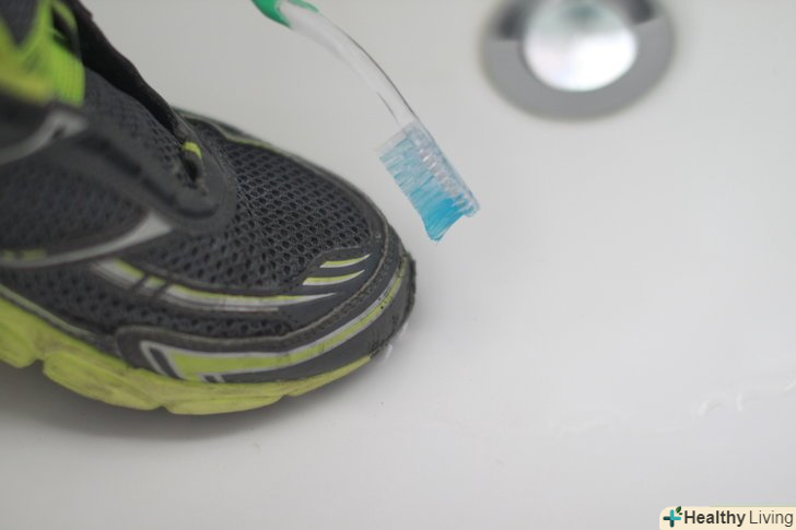 Занурте щітку з м'якою щетиною в мильну води, потім акуратно почистіть спортивне взуття як зовні, так і зсередини. за допомогою білої нейлонової мочалки для посуду потріть плями на взутті. За допомогою старої зубної щітки очистіть важкодоступні місця, такі як навколо язичка та інші.