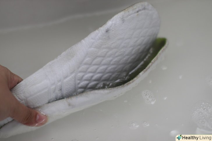 Наповніть раковину (або таз) теплою водою. додайте кілька крапель рідини для миття посуду, або рідкого натурального оливкового мила, або спеціального миючого засобу для спортивного взуття.