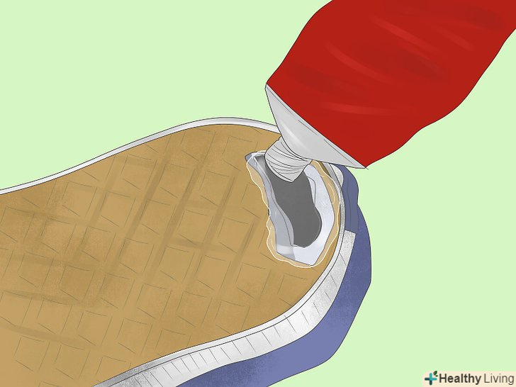 Заповніть дірку клеєм для взуття. не торкаючись руками клеїть речовини, акуратно видавіть адгезив і залийте їм дірку з боку підошви. Нічого страшного, якщо надлишки клею будуть витікати.