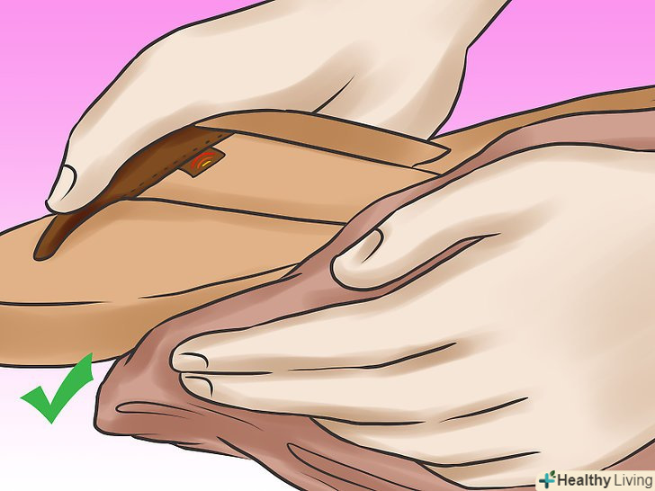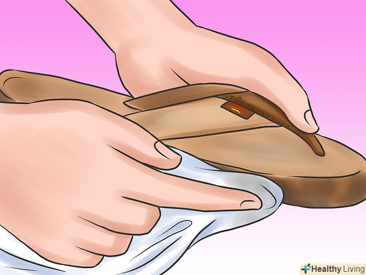 Висушіть сандалі. за допомогою паперового рушника витріть вологу з взуття. Переконайтеся, що зробили це дуже ретельно, так як залишки мила можуть надалі пошкодити шкіру. [6]- Гарною ідеєю перед використанням стане сушка сандалій на сонці, яка допоможе повністю видалити вологу.