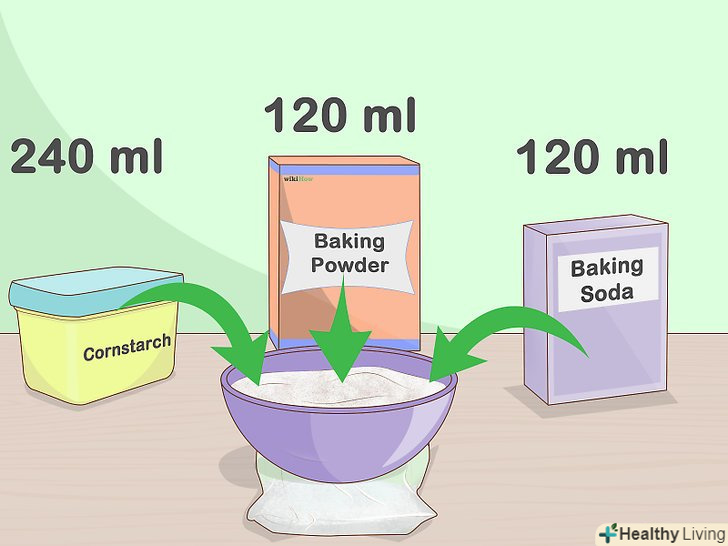 Приготуйте порошковий дезодорант. змішайте 240 г кукурудзяного крохмалю, 120 г харчової соди і 120 г розпушувача в поліетиленовому пакеті на застібці. Запечатайте пакет і струсіть його, щоб всі 3 порошку гарненько перемішалися. Ця суміш буде діяти як дезодорант. [10]