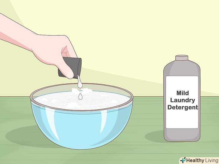 Додайте кілька крапель м'якого миючого засобу. використовуйте м'який миючий засіб для прання або засіб для миття посуду. Додайте в холодну воду пару крапель миючого засобу. Налийте достатньо засобу, щоб на поверхні перемішаного розчину утворилися бульбашки. [3]
