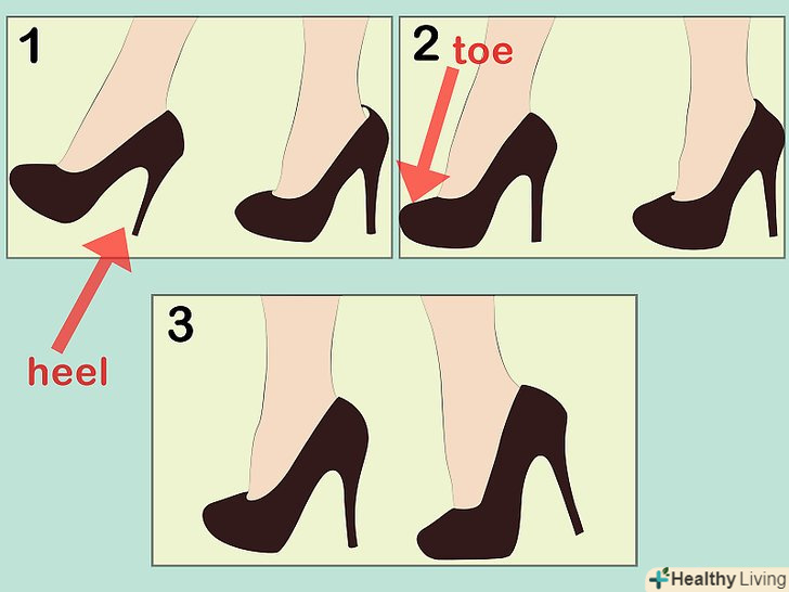 Навчіться ходити на підборах правильно. надягаючи взуття на підборах, ви автоматично змінюєте положення вашого тіла через новий кут нахилу, під яким ви тепер будете переміщати ваші ноги і ставити на пів-ступні. Спробуйте виконати просту вправу, яке дозволить навчитися правильно ходити на підборах. Спочатку зробіть крок вперед і поступово переміщайте вагу тіла з п'яти на кінчики пальців. Повторюйте слова "п'ята-носок; п'ята-носок; п'ята-носок..." з кожним кроком в якості нагадування, і перш ніж ви зрозумієте, як саме це сталося, ви вже будете стійко і впевнено почувати себе на підборах. [8]- Зрештою, ви розвинете м'язову пам'ять, що дозволить легко і комфортно ходити на підборах.