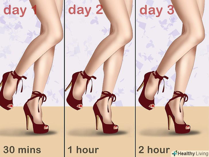 Поступово збільшуйте час пересування на підборах. ви не пройдете шлях від диванного домосіда до учасника марафону за один день. Наприклад, ви можете спочатку комбінувати носіння балеток і туфель на шпильці висотою в десять сантиметрів. Якщо ви плануєте надягати взуття на підборах з особливого приводу, почніть носити їх перед заходом заздалегідь, і з кожним днем поступово збільшуйте інтервали. Спочатку носіть їх півгодини в день, на наступний день – протягом години, а потім – дві години. Це допоможе вам підготуватися заздалегідь.