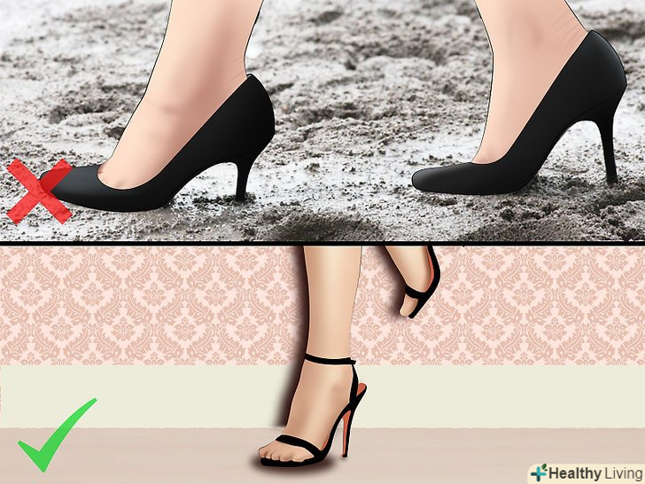 Підбирайте взуття по ситуації. слід підбирати певні типи взуття на підборах, в залежності від того, де ви будете їх носити – на вулиці або всередині будівлі. Якщо ви плануєте провести час на галявині з травою, або пересуватися на великі відстані разом з незнайомими людьми, вибирайте таке взуття, яка має найбільшу площу зіткнення з землею, що дозволить вам не спіткнутися. Якщо вам потрібна взуття для ходьби в приміщенні, в такому випадку необхідно підбирати взуття з підошвою, яка не буде ковзати.- Високі підбори-шпильки з легкістю проколюють м'який грунт. Ви будете постійно провалюватися в бруд, якщо надягнете таке взуття на вулицю.