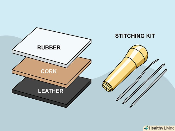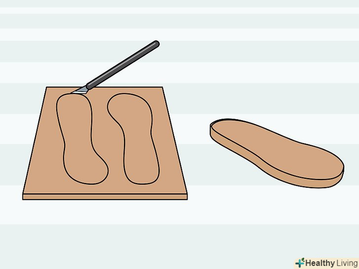 Виріжте підошву. [5] якщо ви купили готову підошву або взяли її від старої пари взуття, вам не доведеться нічого робити на цьому етапі. Якщо ж ви хочете зробити черевики власноруч цілком, вам потрібно буде роздобути кілька шарів пробки. Пробка приємно пружинить і не пропускає воду.- Якщо ви вже зшили верх черевика, можна використовувати його як шаблон для надрізів, хоча найкраще дотримуватися трафарету.